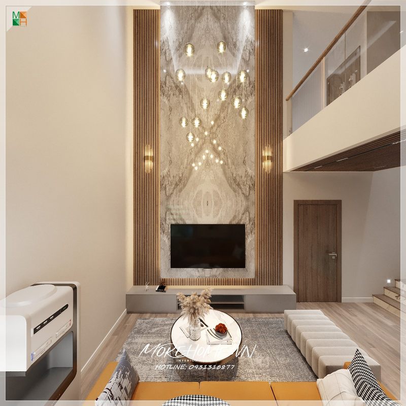 Mẫu thiết kế phòng khách đơn giản nhưng hiện đại, không quá cầu kỳ nhưng đủ để gây ấn tượng cho bất cứ vị khách nào khi bước vào ngôi nhà của bạn. Với thiết kế tivi treo tường độc đáo, ốp tường gỗ kết hợp cùng đá ốp vân mây tạo nên không gian phòng khách trẻ trung mà ấn tượng, nội thất không quá nhiều mà vẫn đầy đủ công năng sử dụng