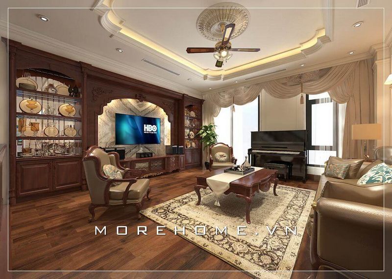 Kệ tivi gỗ tự nhiên tân cổ điển cho phòng khách biệt thự Imperia Hải Phòng