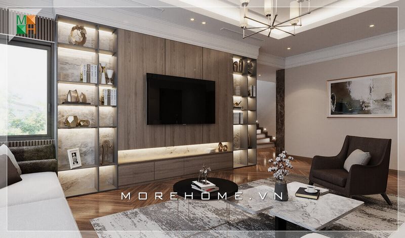 Mẫu kệ tivi phòng khách cao cấp, với thiết kế vách treo tivi ốp gỗ kết hợp kệ trang trí, vừa tiện lợi để trưng bày những món đồ yêu thích của gia đình vừa đóng vai trò như một bức vách ngăn cách cầu thang