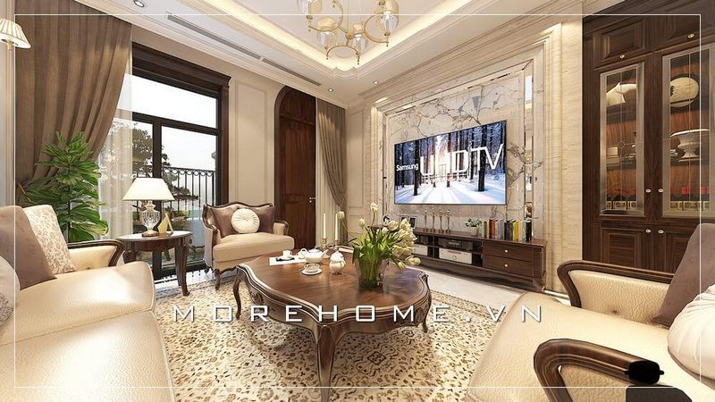Nội thất tân cổ điển từ gỗ óc chó cao cấp tạo nên bộ sofa sang trọng nổi bật trong không gian phòng khách của biệt thự, nhà phố