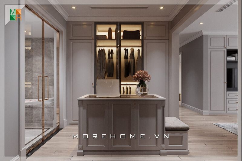 Ấn tượng với mẫu thiết kế phòng thay đồ với tủ quần áo âm tường cùng đảo phụ kiện chung cư, biệt thự, nhà phố đa năng được đặt ngay giữa trung tâm không gian căn phòng.