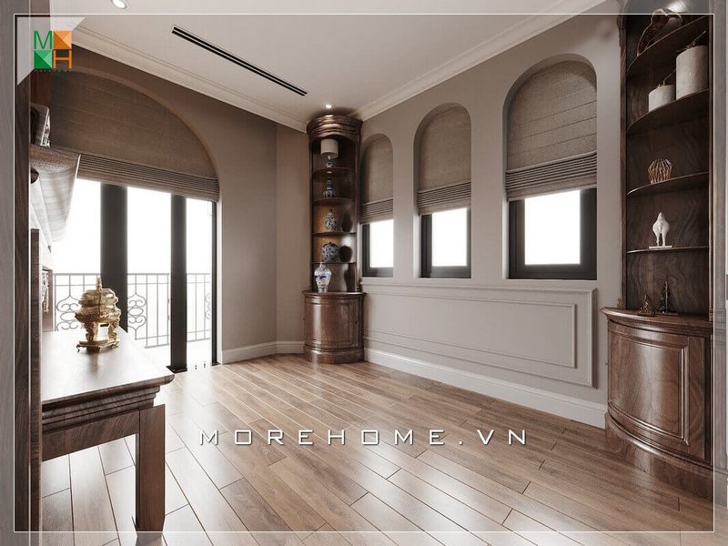 Thiết kế bàn thờ tân cổ điển nghệ thuật từ gỗ óc chó cao cấp xứng đáng trong không gian thiêng liêng của nhà phố, biệt thự.