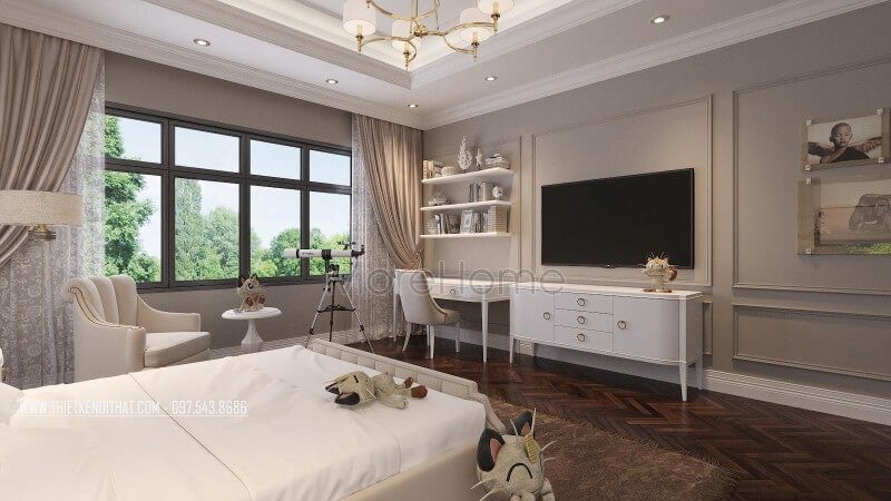 Giải quyết tối ưu được diện tích bằng tủ kệ âm tường kịch trần sử dụng được hết khoảng không phía trên đem lại sự gọn gàng và đẹp mắt cho không gian phòng