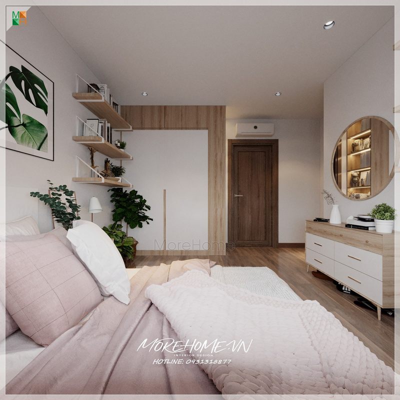 Một chiếc giường diện tích vừa phải, tủ màu trắng rộng rãi để được nhiều quần áo để đồ dùng cá nhân của gia chủ trong phòng ngủ thuận lợi.