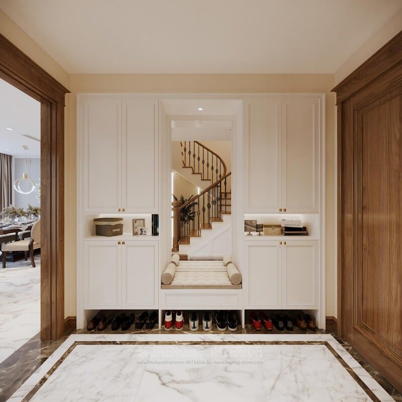 Kệ tủ giày biệt thự được thiết kế theo phong cách hiện đại với tone màu trắng tinh tế chủ đạo chắc chắn sẽ là điểm nhấn xinh xắn trong nội thất của bạn