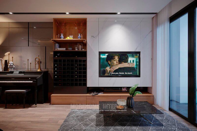 Sự kết hợp hoàn hảo giữa kệ ti vi, kệ tủ trang trí và kệ tủ rượu, chức năng 3 trong 1 giúp tiết kiệm diện tích căn phòng, mang đến sự thuận tiện cho gia chủ trong quá trình sử dụng