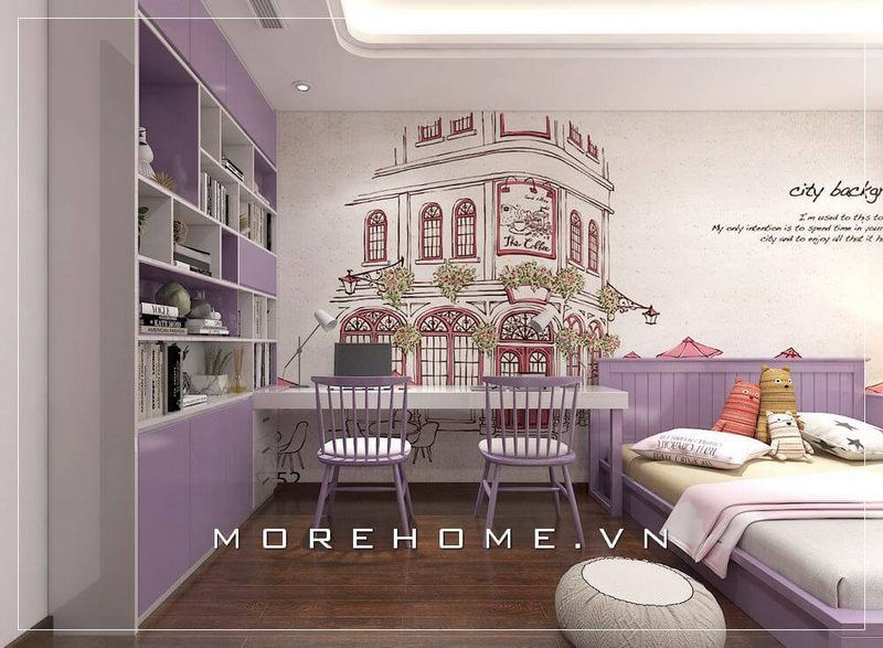 Bàn học của con được thiết kế hiện đại đặt ngay cạnh cửa sổ, giá sách treo ngay trên bàn học, giúp trí tưởng tượng bay cao, giúp bé có tư duy tốt hơn.