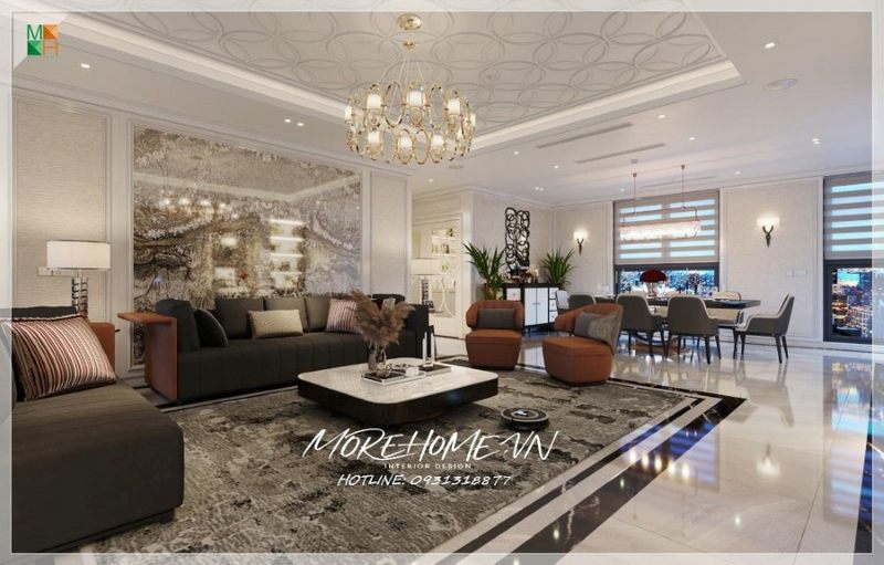 Sofa phòng khách hiện đại màu xám kết hợp với bàn trà tinh tế góp phần mang đến sự sang trọng, thân thiện ngay khi bước chân vào căn phòng.