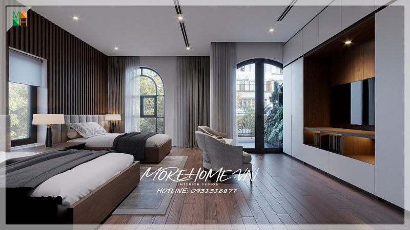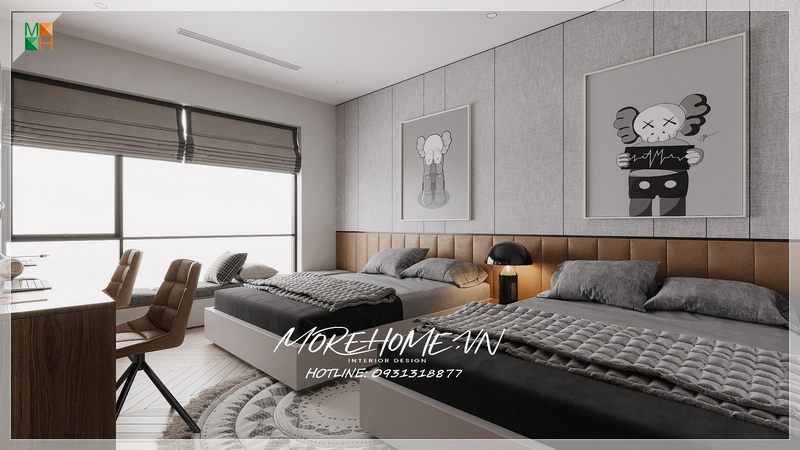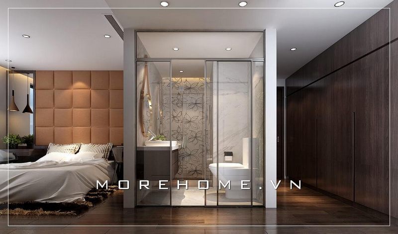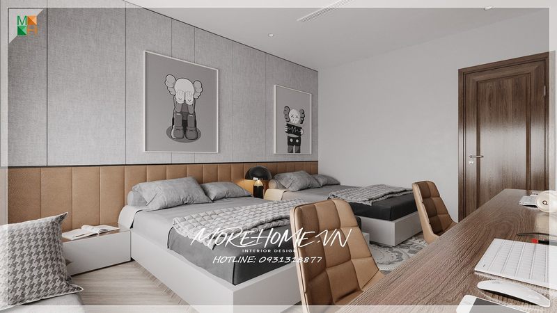 Thiết kế nội thất giường ngủ chung cư cao cấp, đầu giường bọc đệm da phong cách hiện đại, sang trọng