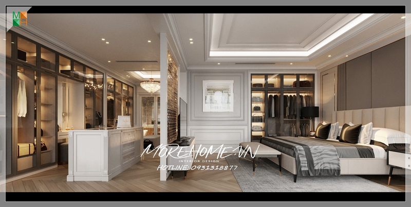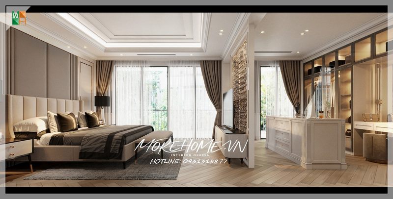 Chiếc giường bọc nệm đầu giường với phong cách tân cổ điển tạo điểm riêng cho phòng ngủ.
