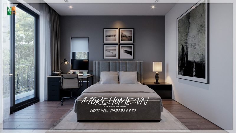 Giường gỗ sồi tự nhiên gam sáng kết hợp nệm đầu giường xám sẫm tạo điểm nhấn ấn tượng cho phòng ngủ biệt thự nhỏ hiện đại trẻ trung.