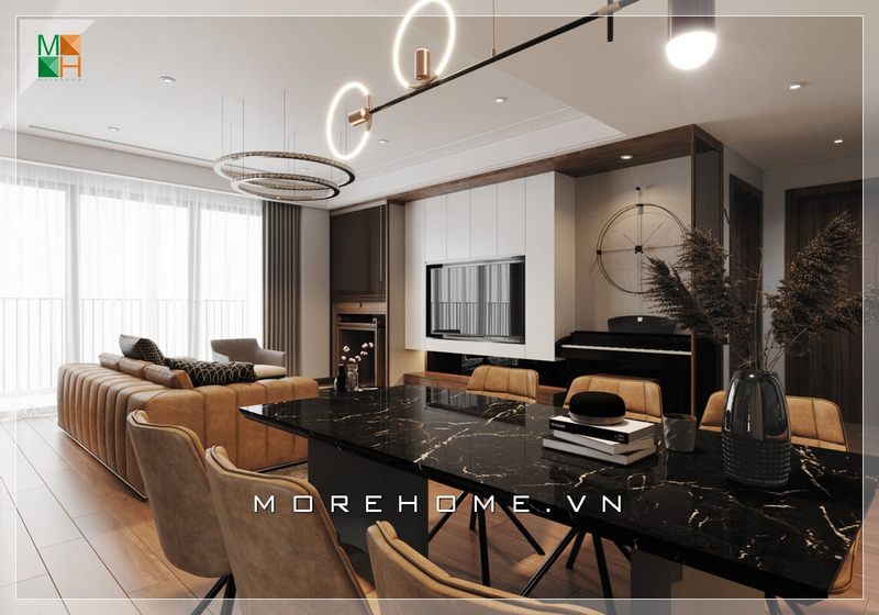 Việc bố trí phòng ăn mở liền kề phòng khách đã không còn xa lạ trong xu hướng thiết kế hiện nay