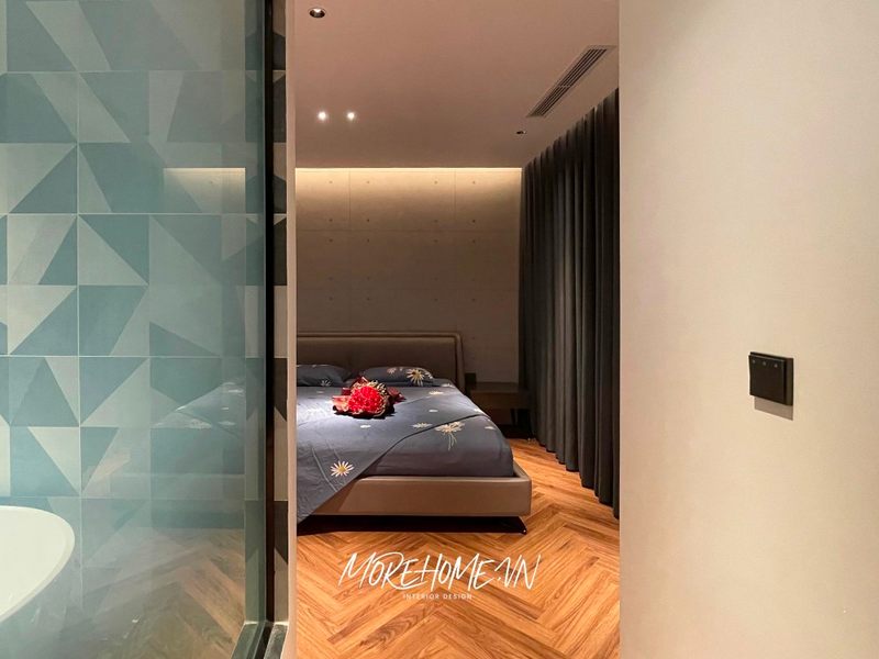 Giường ngủ biệt thự hiện đại có phần đầu giường bọc da để tạo ra một không gian phòng ngủ tinh tế hơn.