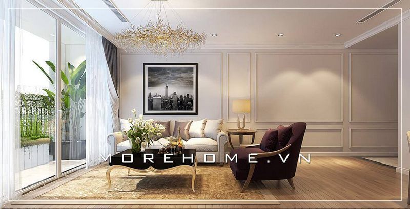 Sofa bọc vải nhung mềm mại màu trắng được thiết kế theo kiểu văng tiện lợi với phong cách tân cổ điển sẽ góp phần tạo nên cảm giác ấm cúng và tiện nghi thoải mái cho không gian phòng khách chung cư.