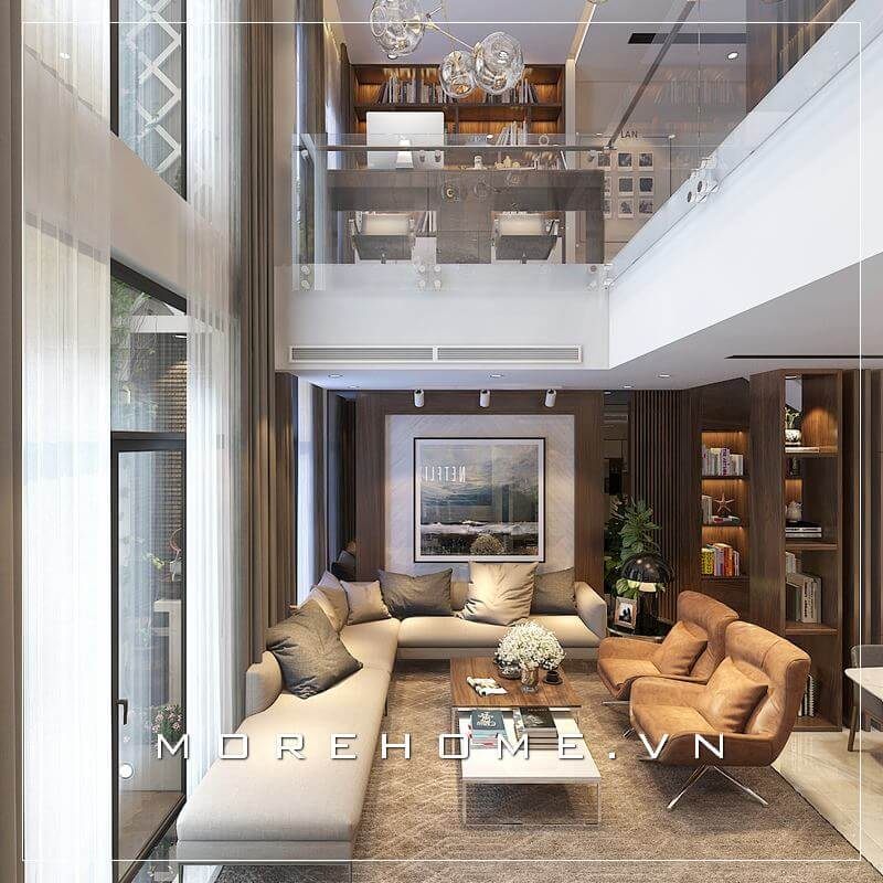Không gian phòng khách biệt thự nhà phố có vẻ đẹp thu hút mọi ánh nhìn, tâm điểm là bộ sofa tân cổ điển uốn lượn nghệ thuật của khung gỗ óc chó đẳng cấp, bọc da tinh tế sang trọng.